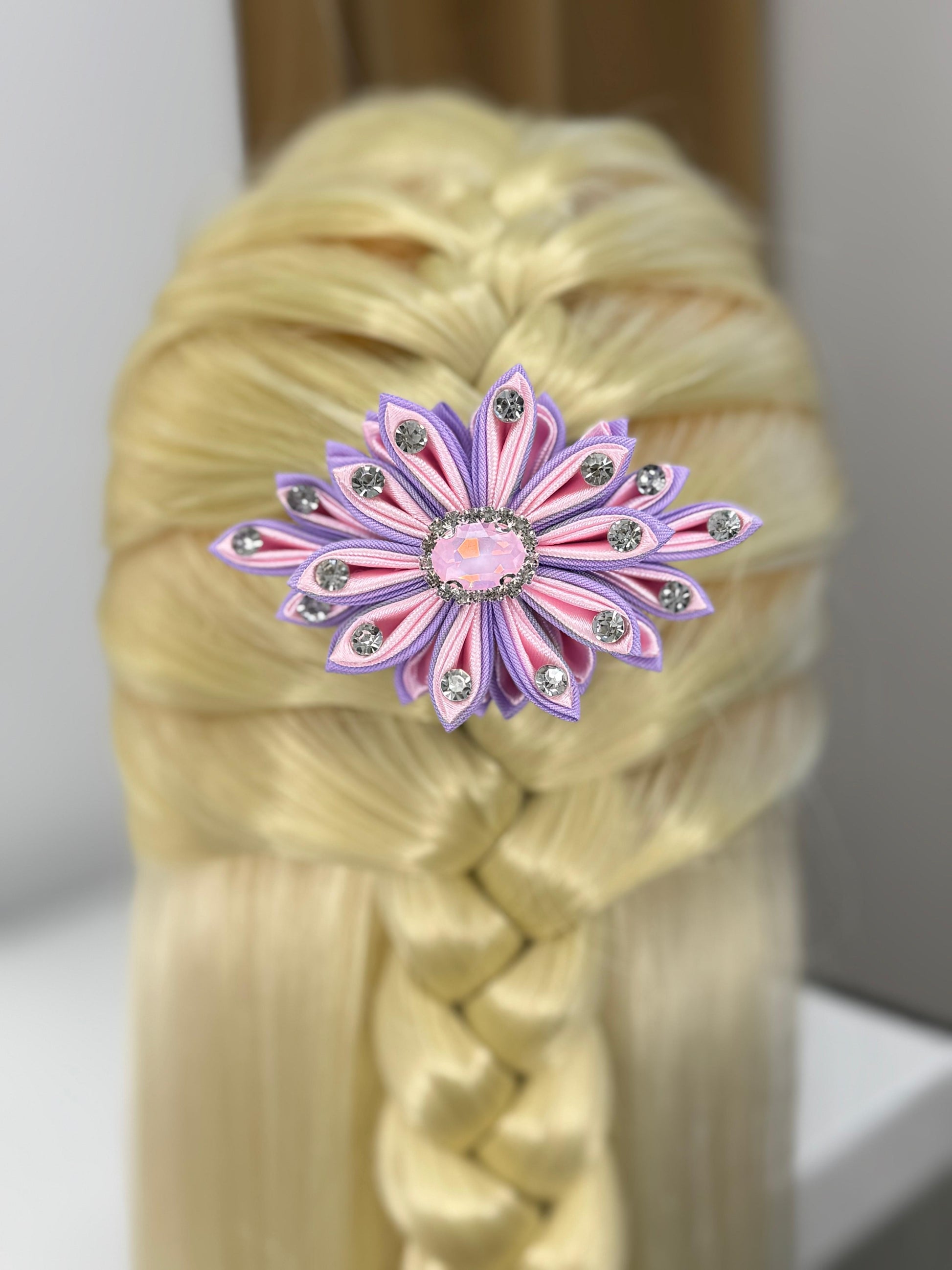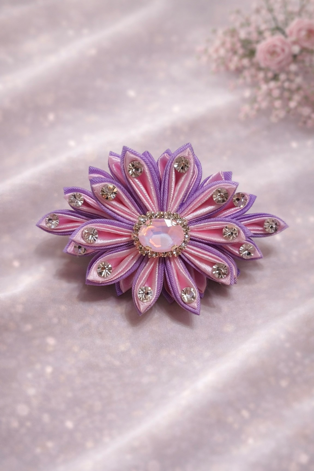 Každý skladaný prvok vytvára dynamickú, takmer kvetinovú štruktúru, ktorá pôsobí bohato a plasticky. Kombinácia jemných ružových a fialových tónov spolu s trblietavými kamienkami vytvára efekt „iskrenia“ pri každom pohybe.