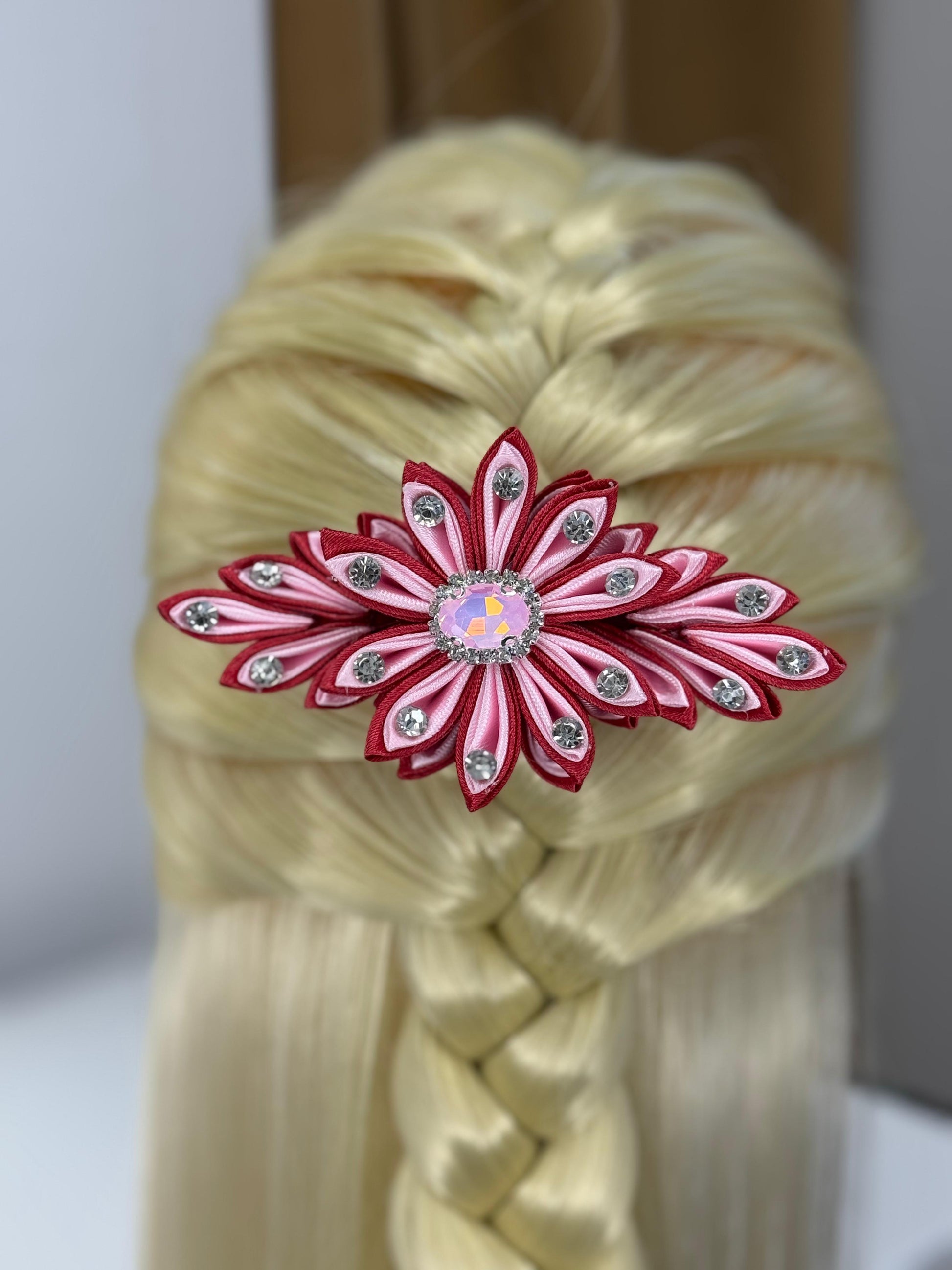 Každý skladaný prvok vytvára dynamickú, takmer kvetinovú štruktúru, ktorá pôsobí bohato a plasticky. Kombinácia jemných ružových a fialových tónov spolu s trblietavými kamienkami vytvára efekt „iskrenia“ pri každom pohybe.