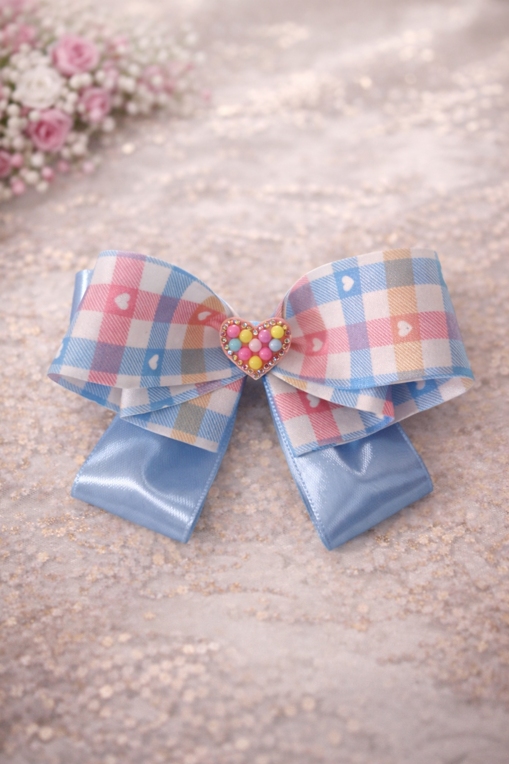 Pastelový károvaný vzor v kombinácii modrej, ružovej a jemných tónov vytvára svieži a hravý vizuál. Lesklá spodná stuha dodáva kontrast a jemný lesk, zatiaľ čo dominantné srdiečko zdobené farebnými detailmi pôsobí ako malý sladký šperk.